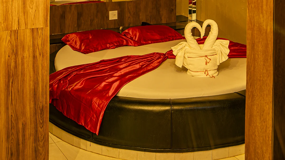 Um cenário romântico para viver momentos que ficam na memória. Cama redonda com lençóis vermelhos, espelho no teto e decoração especial para celebrar o amor. Conforto, privacidade e clima perfeito para surpreender quem você ama.